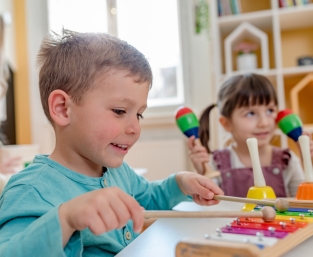 We nemen plaats op kleurige zachte matten met vrolijke kussens. Samen met de juf zingen we liedjes, dansen we en doen we muzikale spelletjes. Ook maken we muziek en geluid op instrumenten en andere attributen.