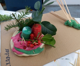 12 december: Kerststukje: met zoutbrooddeeg in verschillende kleuren en kerstversiersels een kerststukje maken.